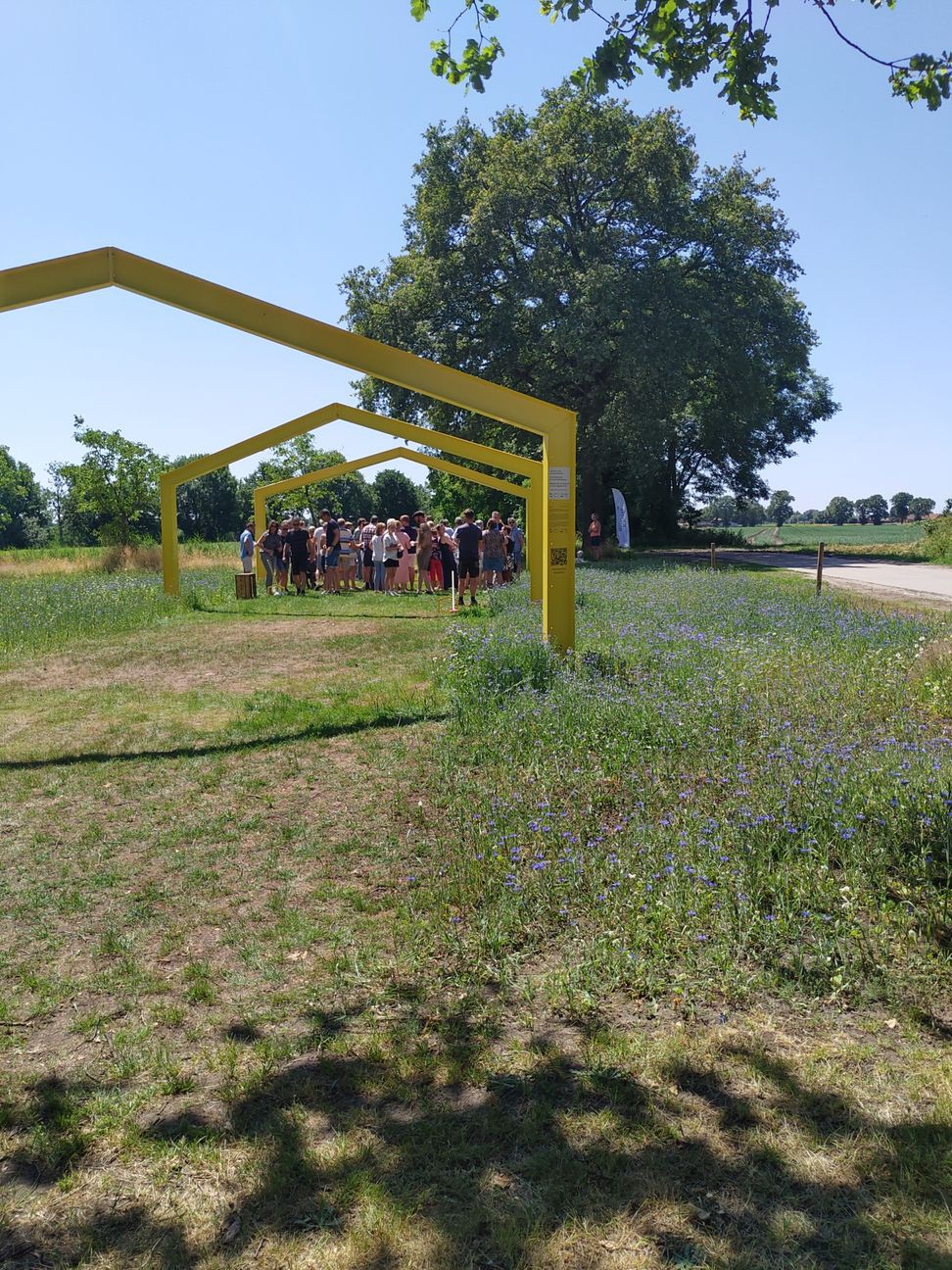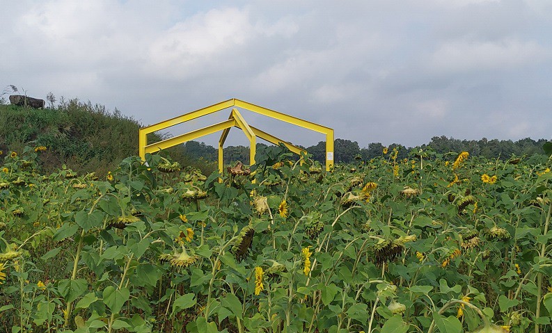 De basis de Gestalten is een eenvoudige, krachtige en herkenbare figuur: een stalen contour in de vorm van een typische stal, als symbool voor de landbouw. Die contouren staan op elke locatie in een verschillende composities, inspelend op de context en het landschap van elke plek. De opvallende gele kleur steekt mooi af tegen het landschap en verwijst naar de kleur van landbouwgebied op het gewestplan. De Gestalten geven een mooie doorkijk op het achterliggende landschap, dat mee wisselt met het weer en de seizoenen – net zoals wij in ons dagelijkse leven als landbouwer moeten doen.